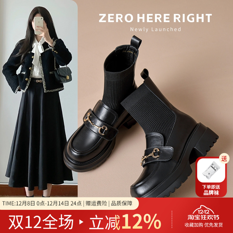 ZHR袜靴女2025秋冬弹力瘦瘦靴短靴小个子厚底增高黑色英伦乐福鞋