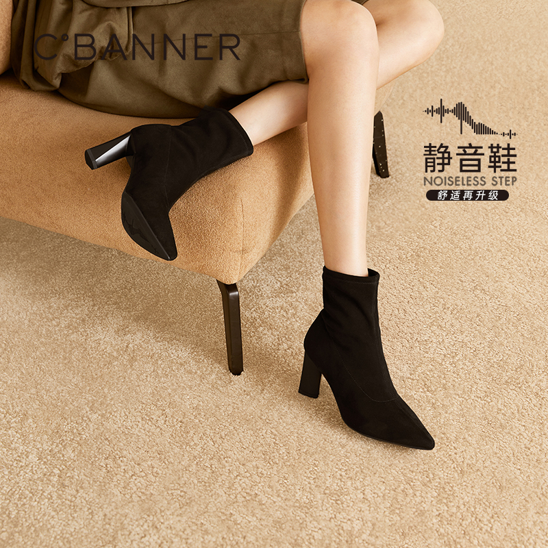 千百度粗跟弹力袜靴女2025冬季新款轻奢瘦瘦靴加绒轻盈保暖短靴子