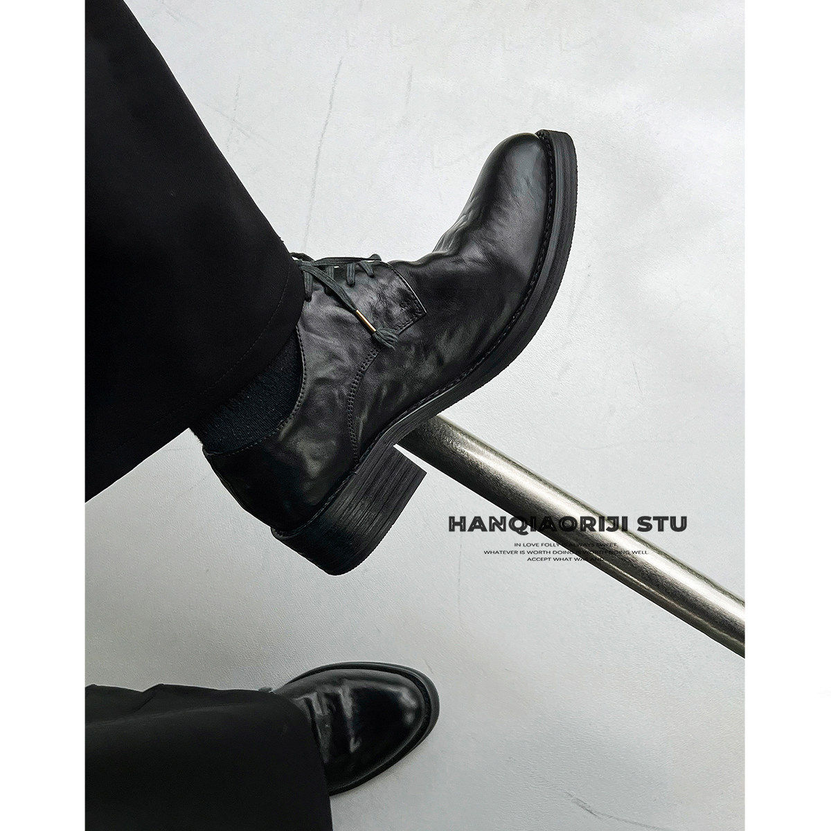 韩桥日记[未来系列]小众雅痞褶皱感头层牛皮尖头皮鞋男厚底德比鞋