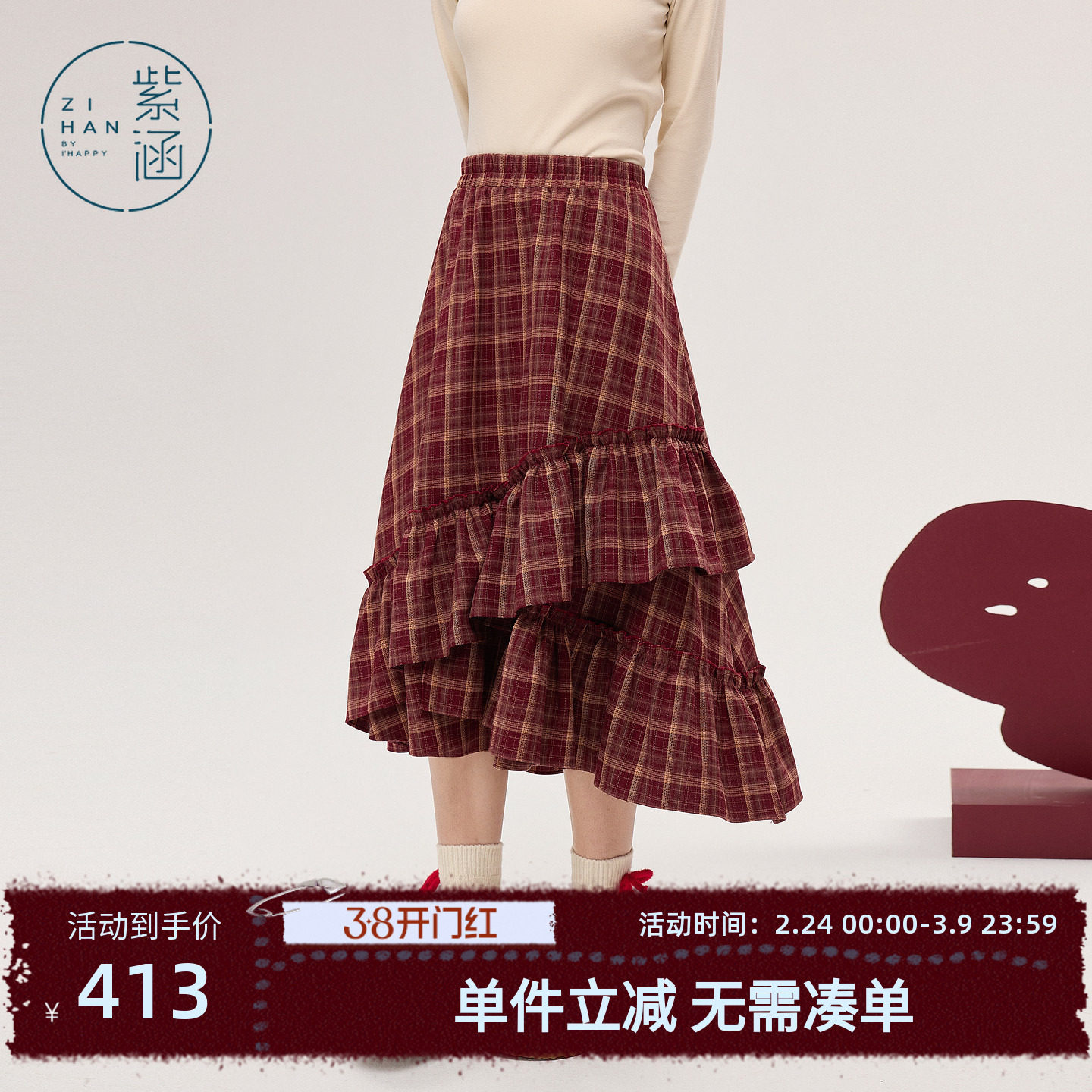 紫涵红格木耳边拼接半身裙女2025冬季新款不规则松紧高腰a字伞裙