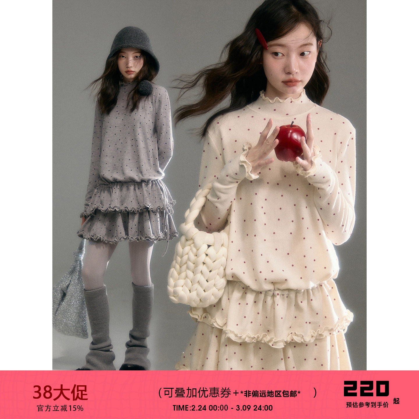 有耳uare原创设计 波点精灵 复古木耳边针织长袖T恤A字半身裙套装