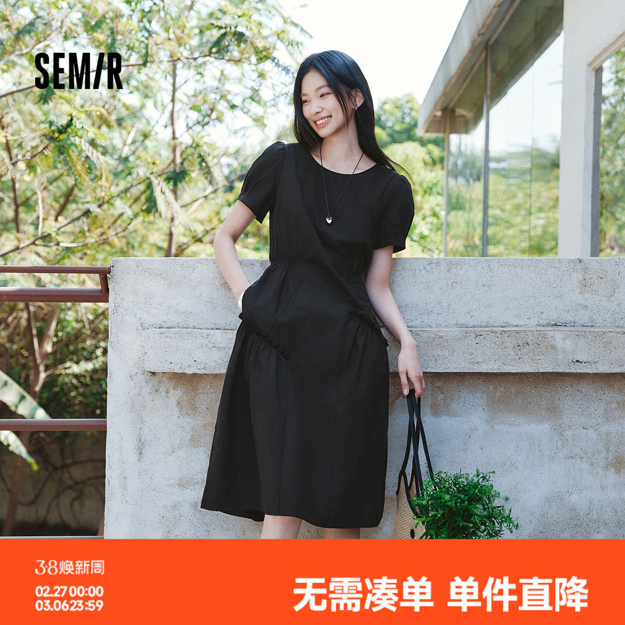 森马连衣裙女夏不规则拼接木耳边泡泡袖收腰优雅气质设计感中长裙