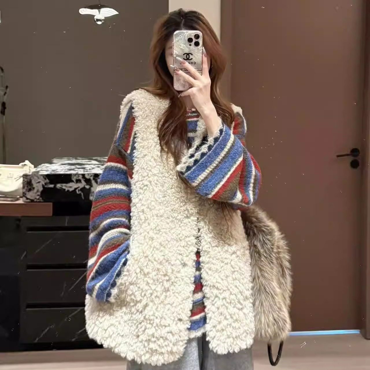 韩系东大门时尚穿搭套装秋冬新款撞色条纹针织毛衣马甲新年两件套
