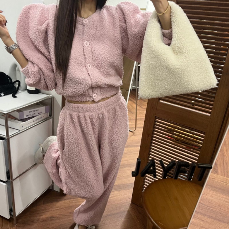 韩国东大门2025加厚羊羔毛系扣开衫外套松紧腰束脚长裤两件套套装