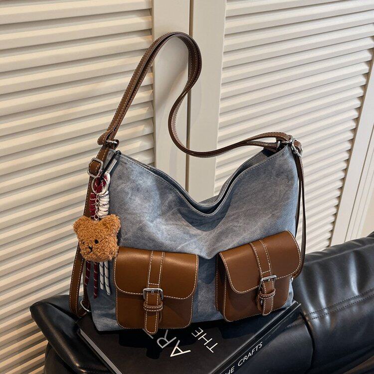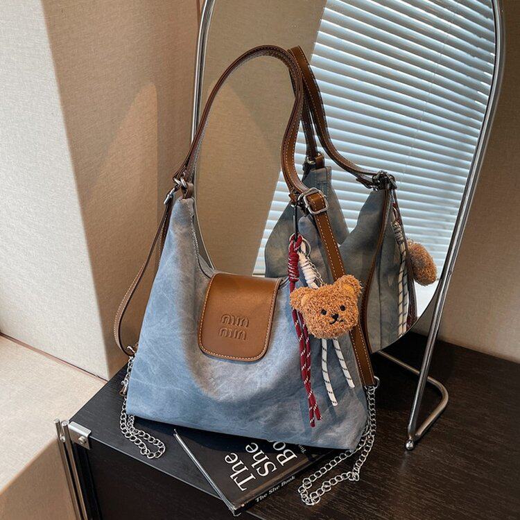 2026夏季新款牛津纺牛仔蓝均码带挂件拉链黑茶色双肩背包校园青年