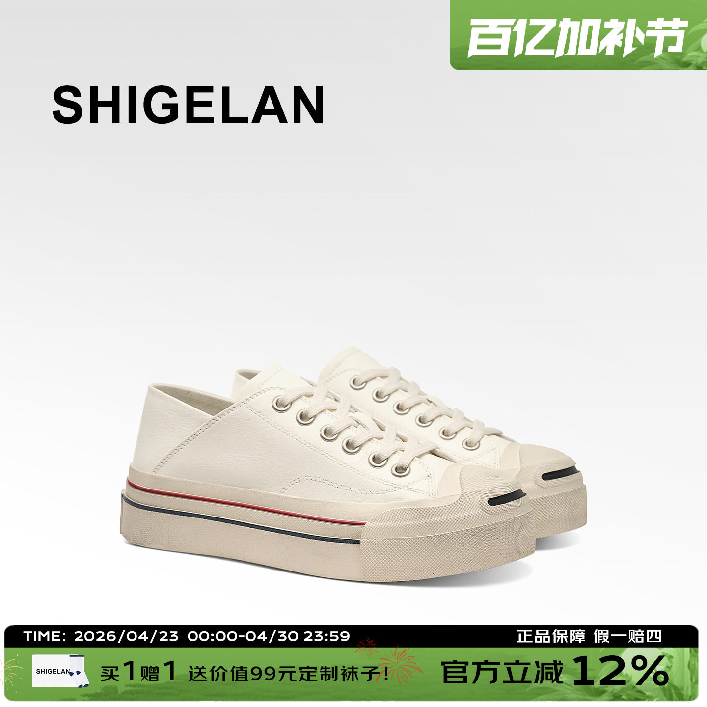 诗歌兰2026新款真皮厚底开口笑板鞋女系带休闲鞋低帮松糕跟帆布鞋