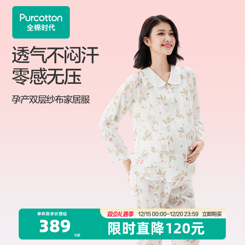 全棉时代孕妇家居服纯棉纱布舒适哺乳喂奶产后月子套装睡衣女礼物