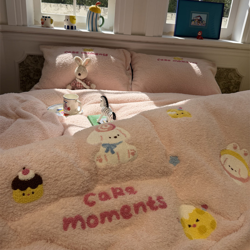 ins卡通秋冬牛奶绒毛巾绣可爱蛋糕小狗床上四件套珊瑚绒1.5m1.8米
