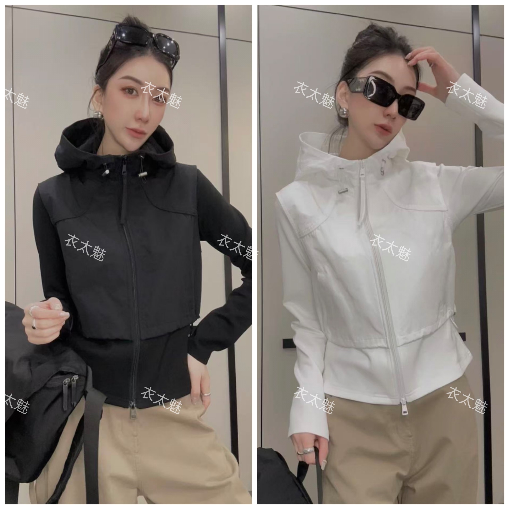 2026早春新款法式时尚设计拉链连帽长袖拼接假两件外套连帽女装