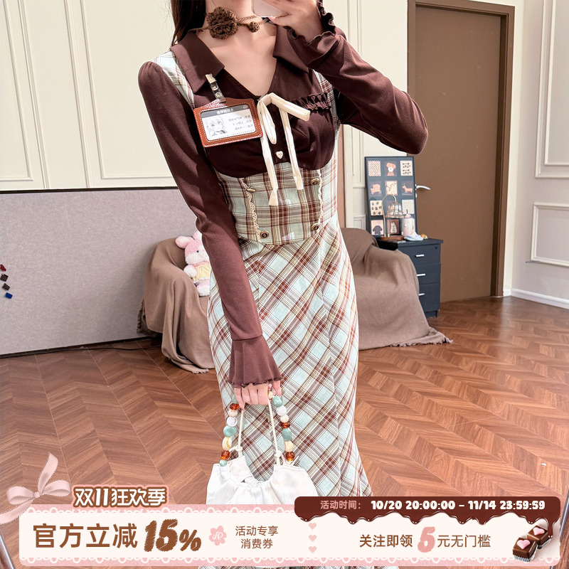 织物猪 森柠格语 千金学院风格纹假两件连衣裙女秋拼接收腰鱼尾裙