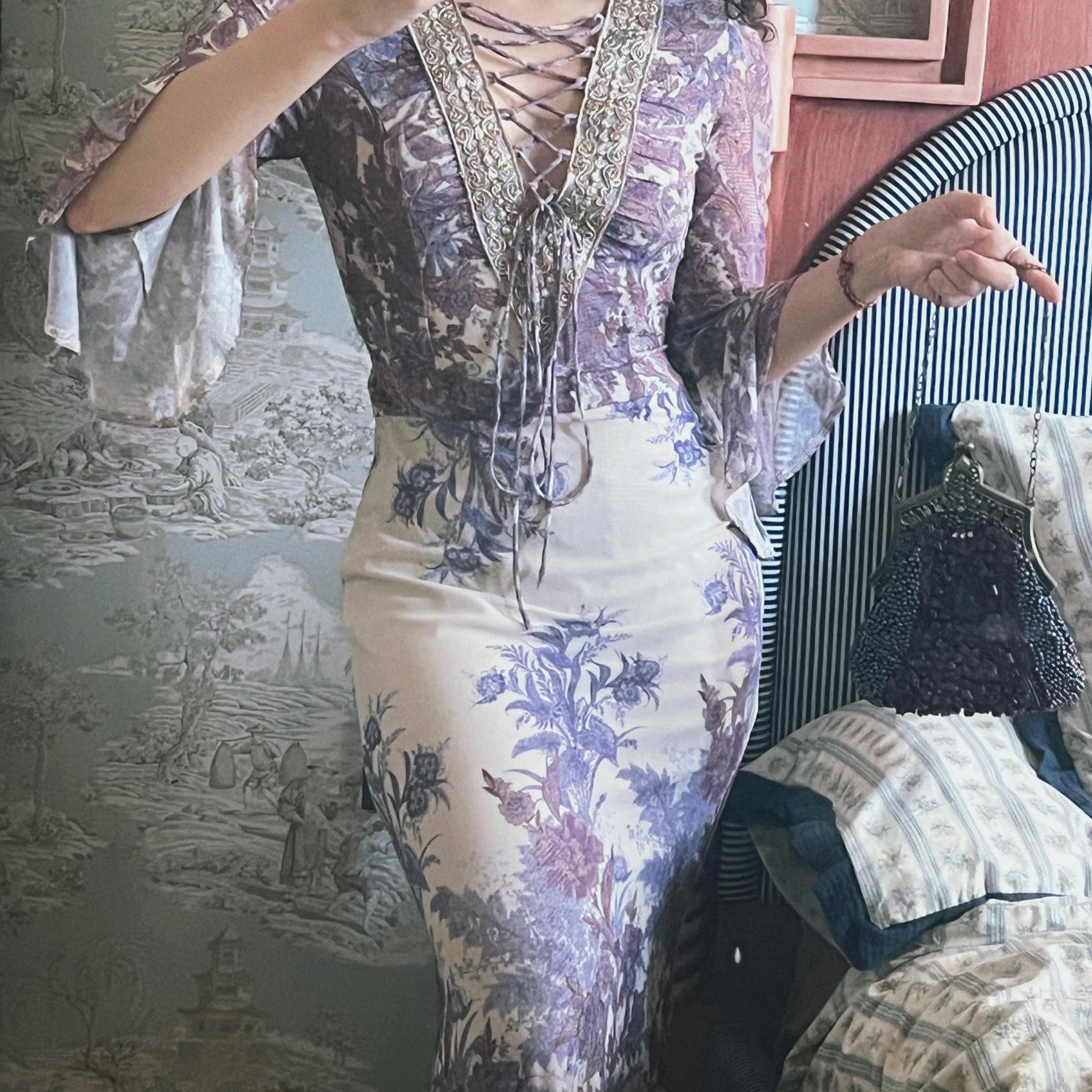OfAkiva“哈索尔”氛围感印花连衣裙女V领高弹修身拼接感鱼尾长裙