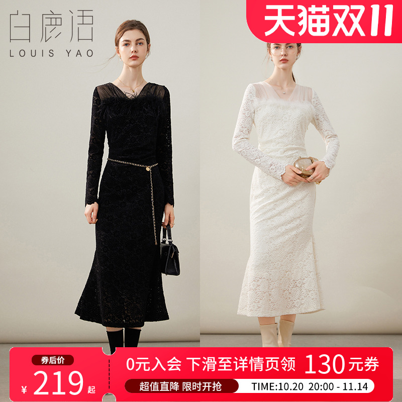 白鹿语绒面蕾丝鱼尾裙25冬款法式优雅V领长款修身拼接连衣裙女