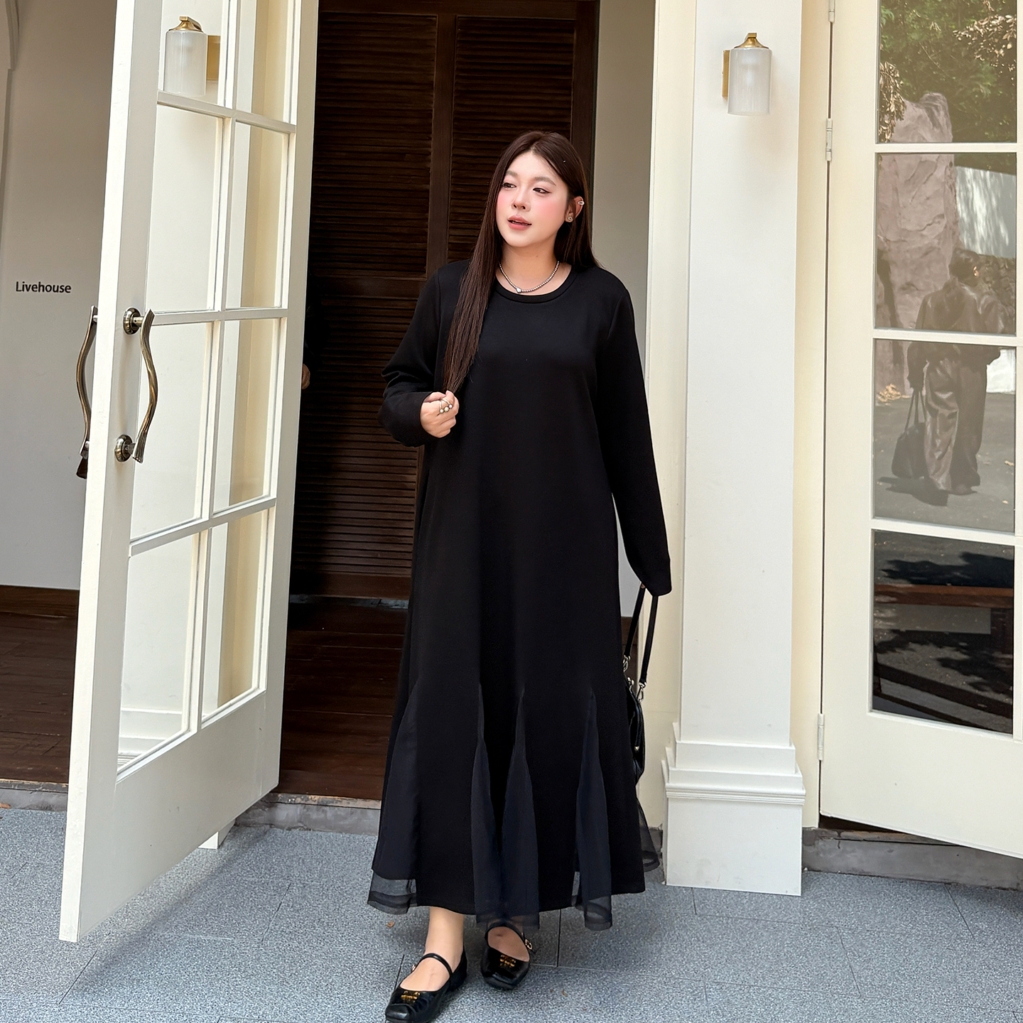 特大码女装2025秋新款加肥200斤胖mm宽松显瘦网纱拼接鱼尾连衣裙