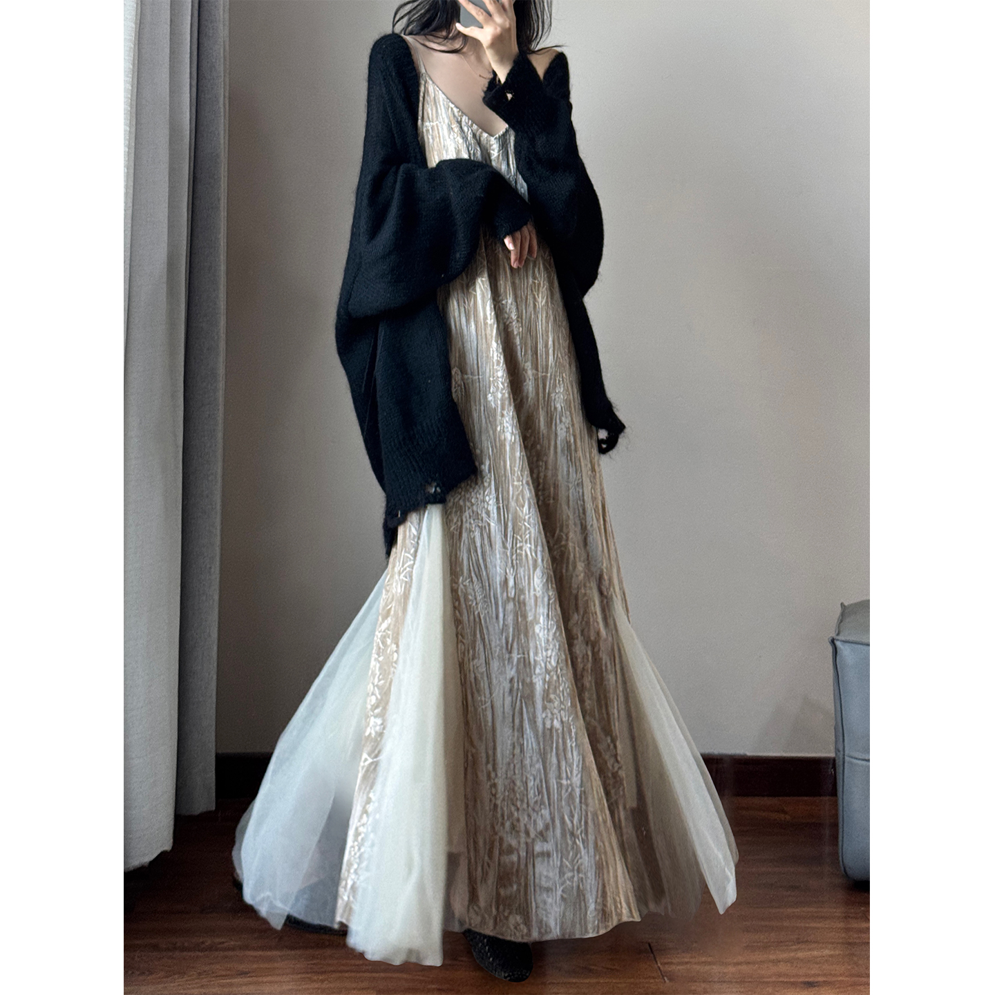梨形身材遮肉长裙 国风提花网纱拼接鱼尾裙 秋丝绒显瘦吊带连衣裙