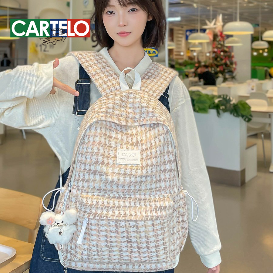 日韩风复古格纹双肩包女高颜值秋冬可爱毛呢背包女孩学院风小书包