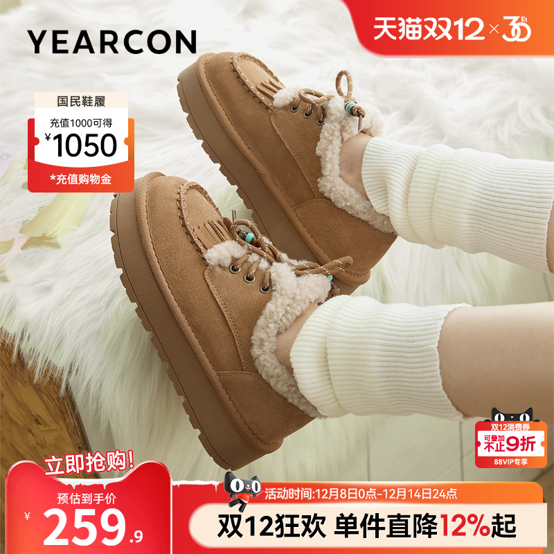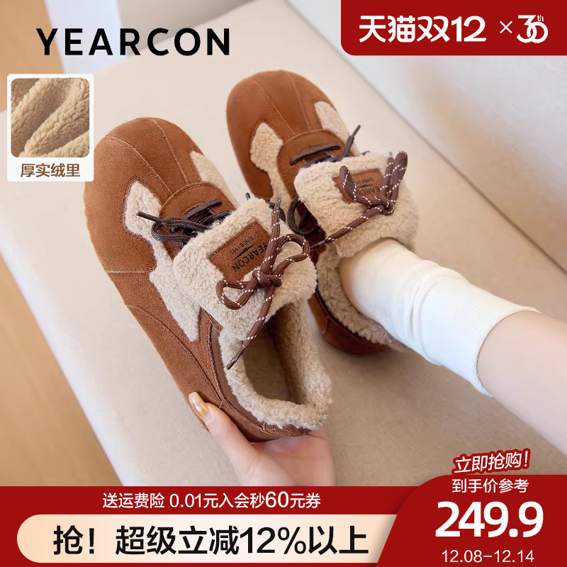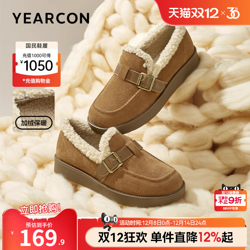 意尔康平底加绒德训鞋女2025冬新款毛毛鞋复古真皮保暖内增高棉鞋