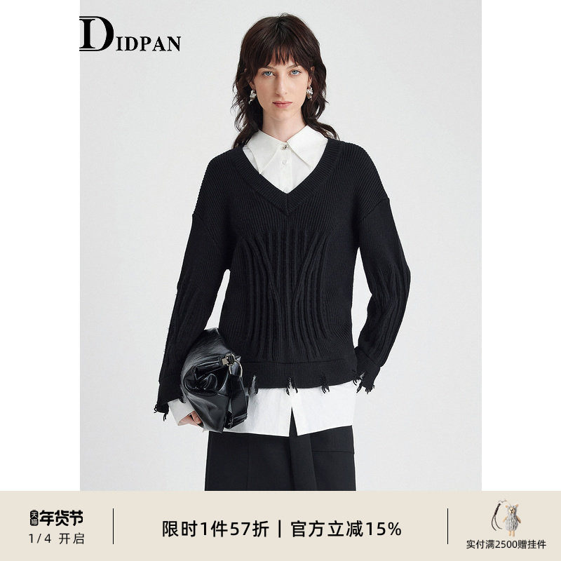 IDPAN女装假两件肌理感针织衫冬季新款设计感撞色拼接套头毛衫