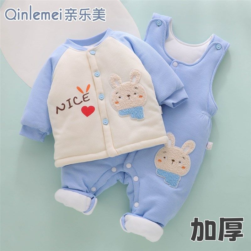 新生婴儿背带裤套装秋冬款加绒宝宝夹棉衣服冬季加厚分体棉服冬装