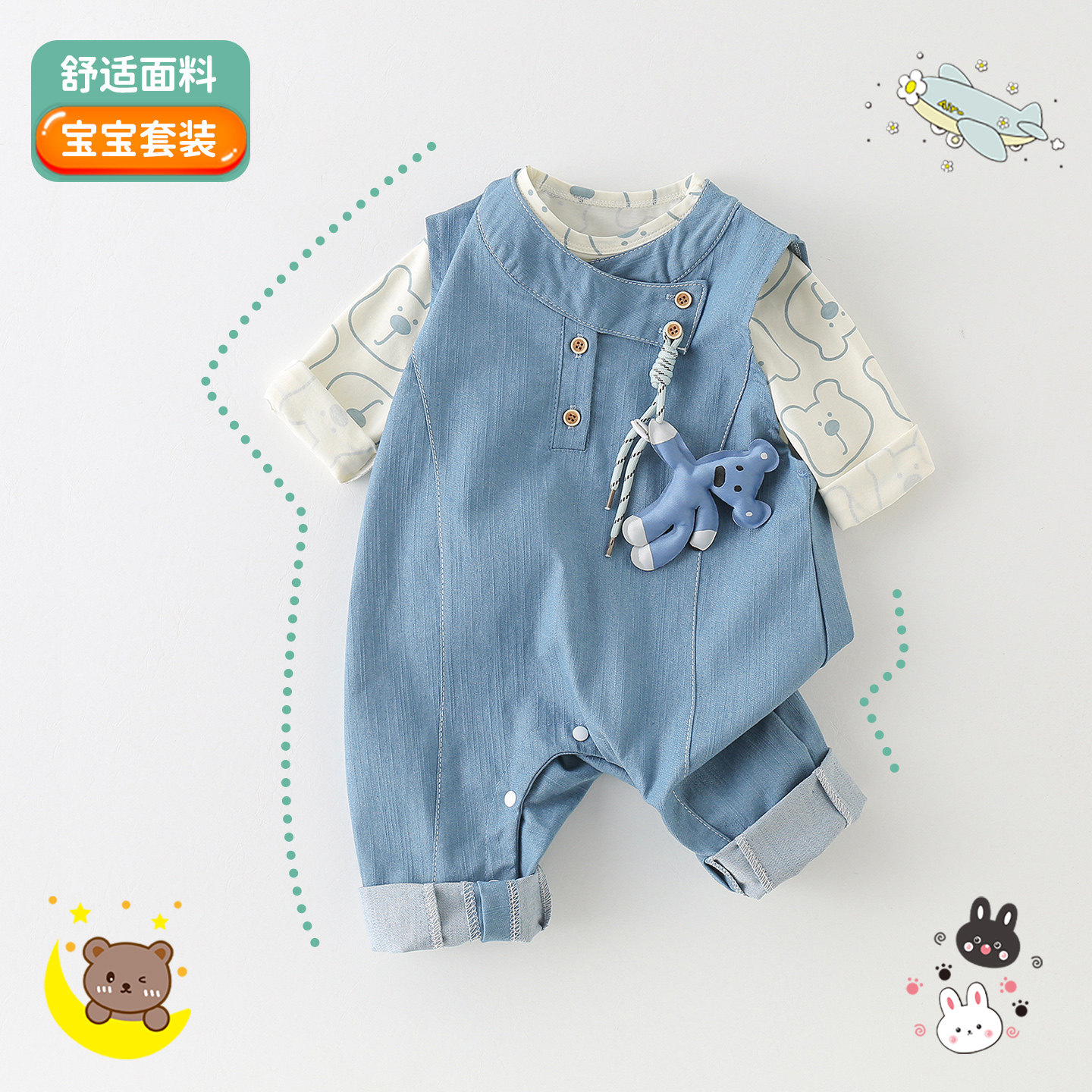 超萌婴儿背带裤套装春秋款男宝宝百天牛仔连体衣无袖宽肩幼儿宽松