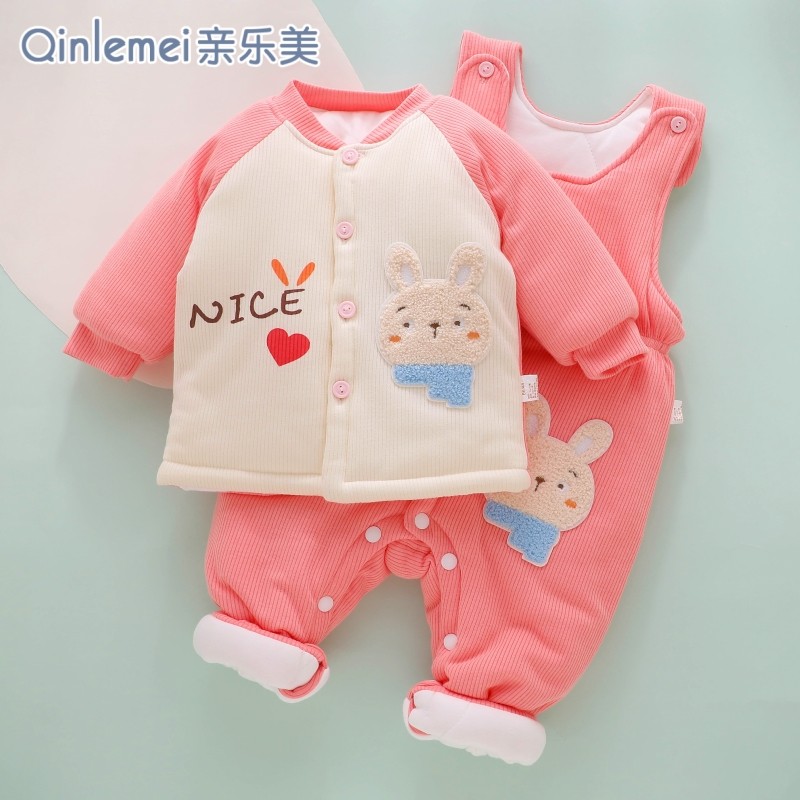 婴儿衣服秋冬新款背带裤冬天套装冬装小月龄女宝宝外出服加厚外套