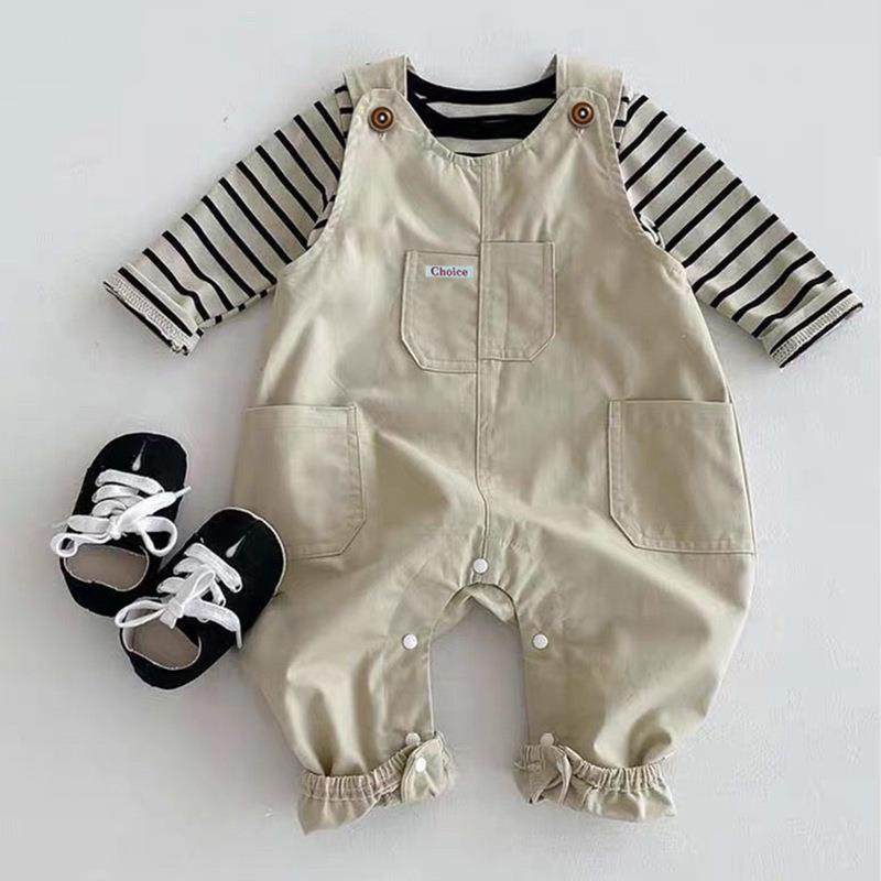婴儿背带裤套装男女宝宝两件套春秋装连体条纹洋气外出服网红儿童