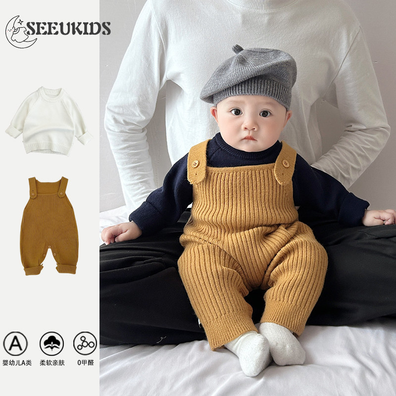婴儿连体衣春秋款针织背带裤男宝宝衣服洋气打底衫新生儿上衣套装