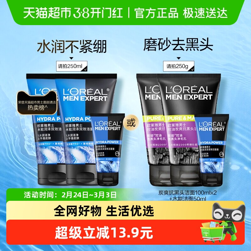 欧莱雅男士专用洗面奶水能保湿炭爽控油抗黑头净化毛孔洁面膏套装