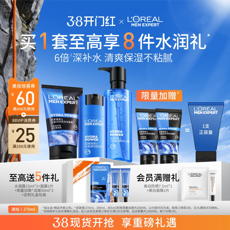 欧莱雅男士水能护肤套装双效洗面奶深层补水长久保湿酷爽男士专用