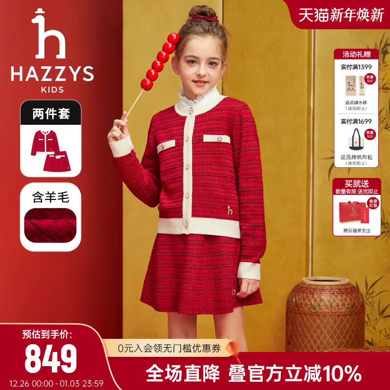 hazzys哈吉斯童装女童套裙2025春新经典红含羊毛针织套裙