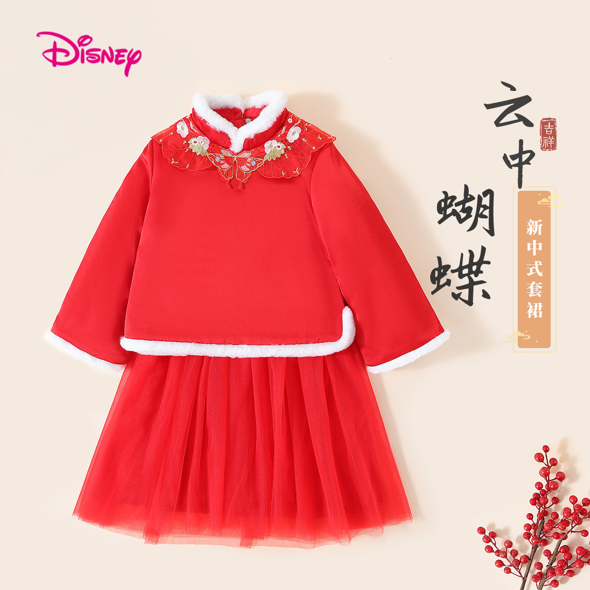 迪士尼女童套裙新年款拜年服中小儿童装夹棉加厚保暖宝宝汉服套装