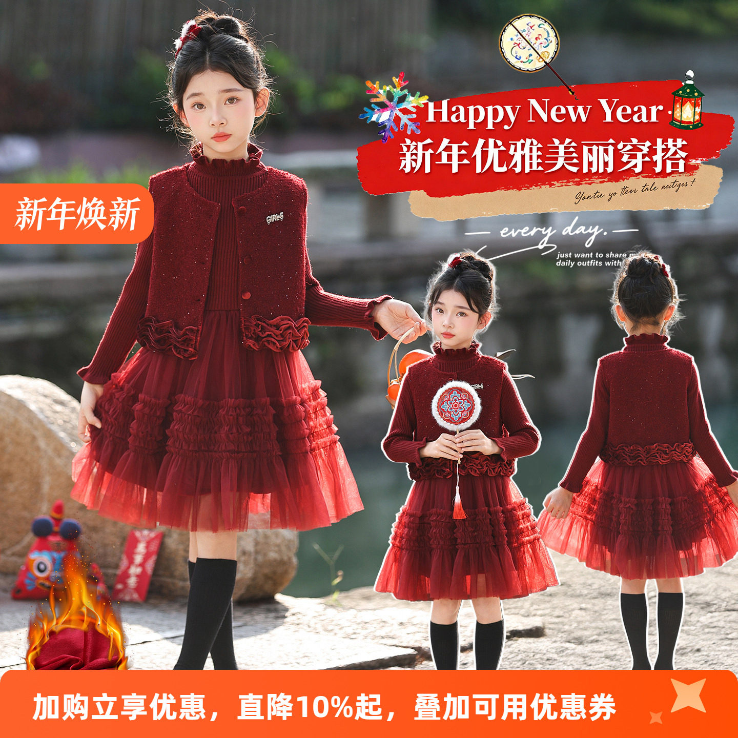 女童连衣裙冬装2025新款洋气儿童蓬蓬网纱公主裙女孩红色圣诞套裙