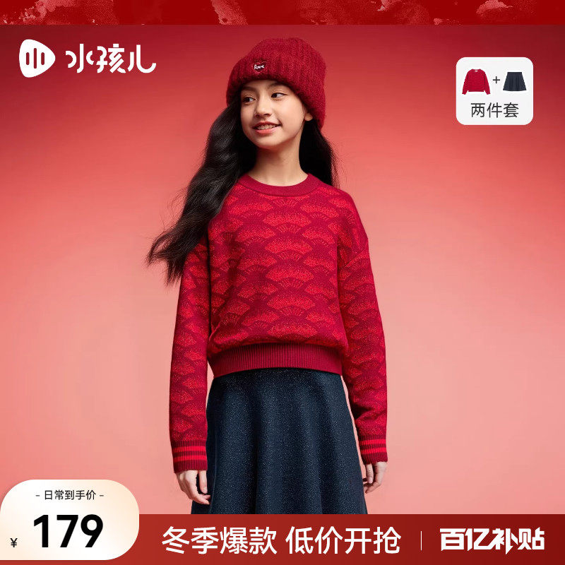 水孩儿女童套裙2025秋冬新品喜庆红色两件套毛衣针织衫半身裙子