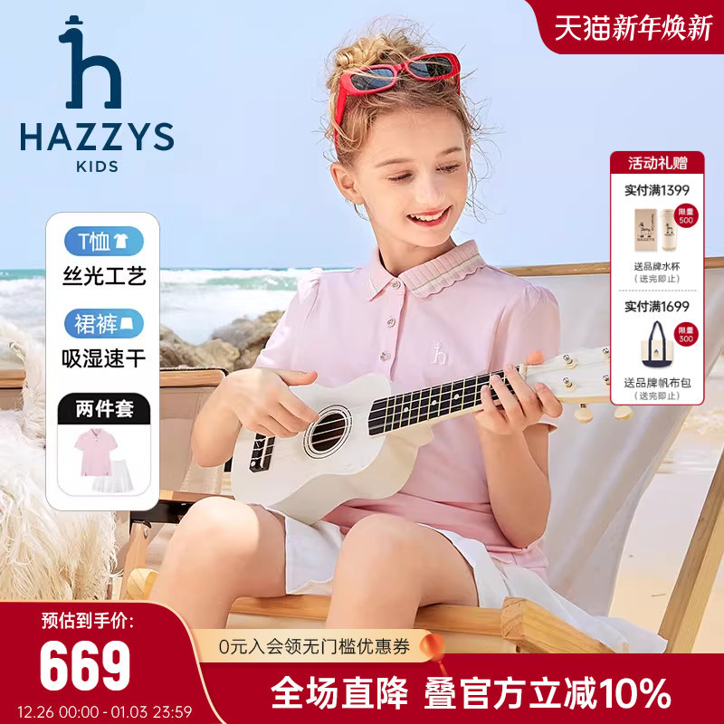 hazzys哈吉斯童装女童套裙2025夏新丝光吸湿速干短袖半裙2件套