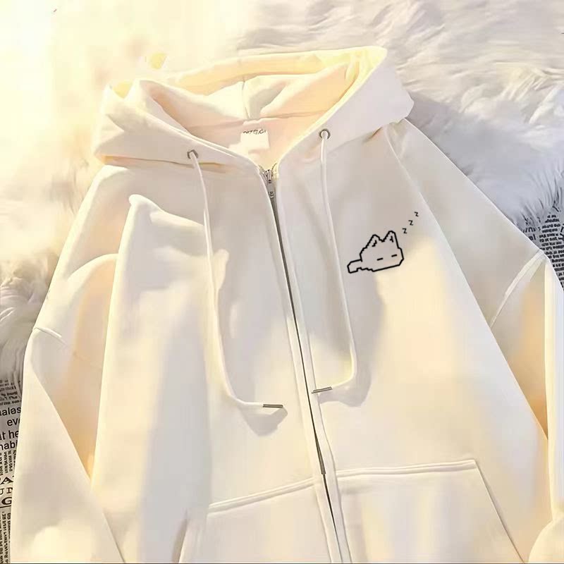 文文不乖原创美式星星猫咪刺绣设计感连帽卫衣女秋冬宽松开衫外套