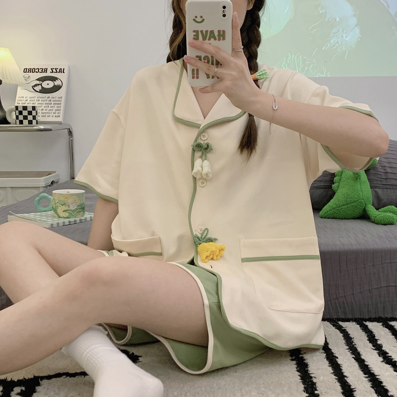 女士夏季睡衣套装甜美短袖开衫家居服可外穿薄款春秋韩版卡通可爱