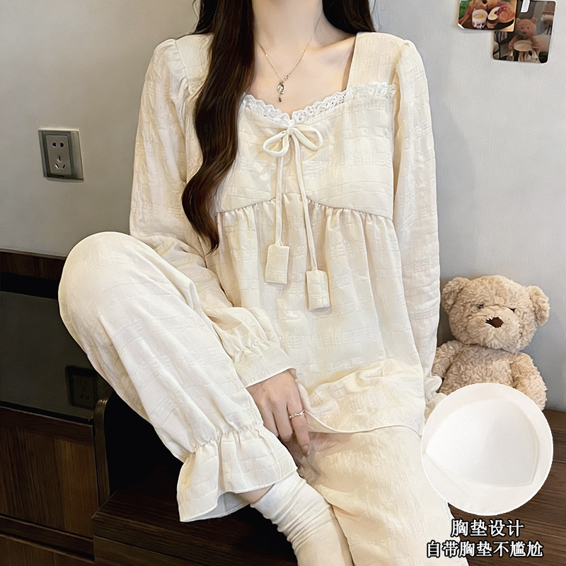 韩版甜美可爱公主风睡衣女长袖长裤带胸垫春秋季家居服套装可外穿