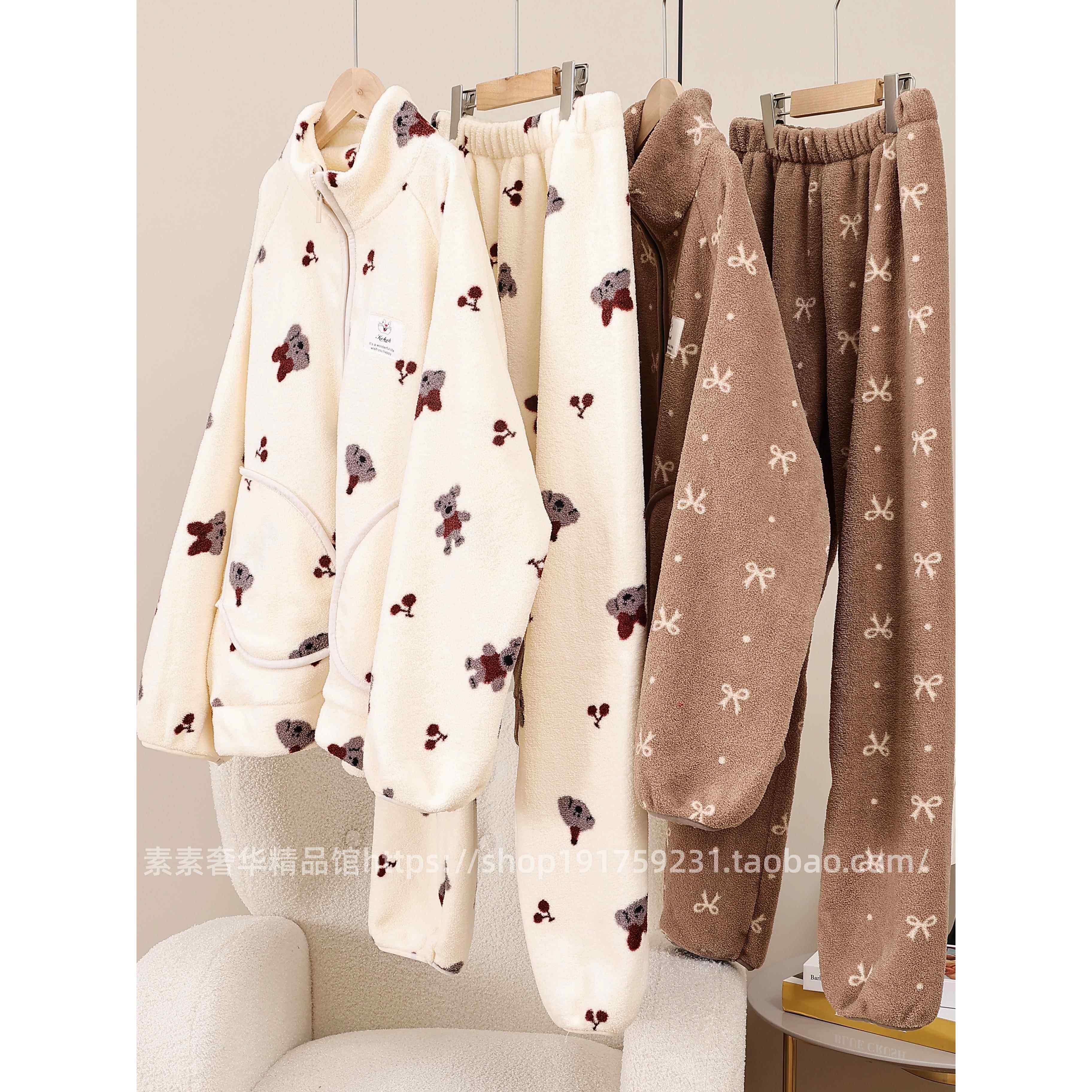 韩版甜美可爱立领拉炼米粒绒睡衣女秋冬时尚休闲软糯可外穿家居服