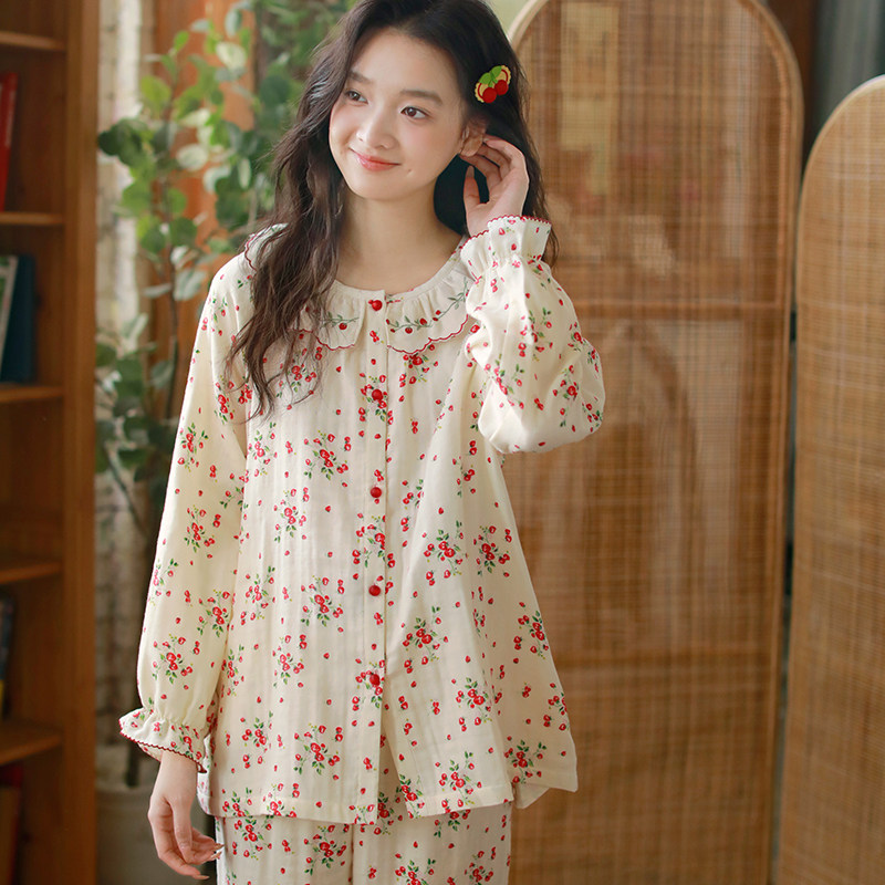 娃娃领三层纱布春秋睡衣女士娃娃领甜美可爱家居服套装韩版田园风
