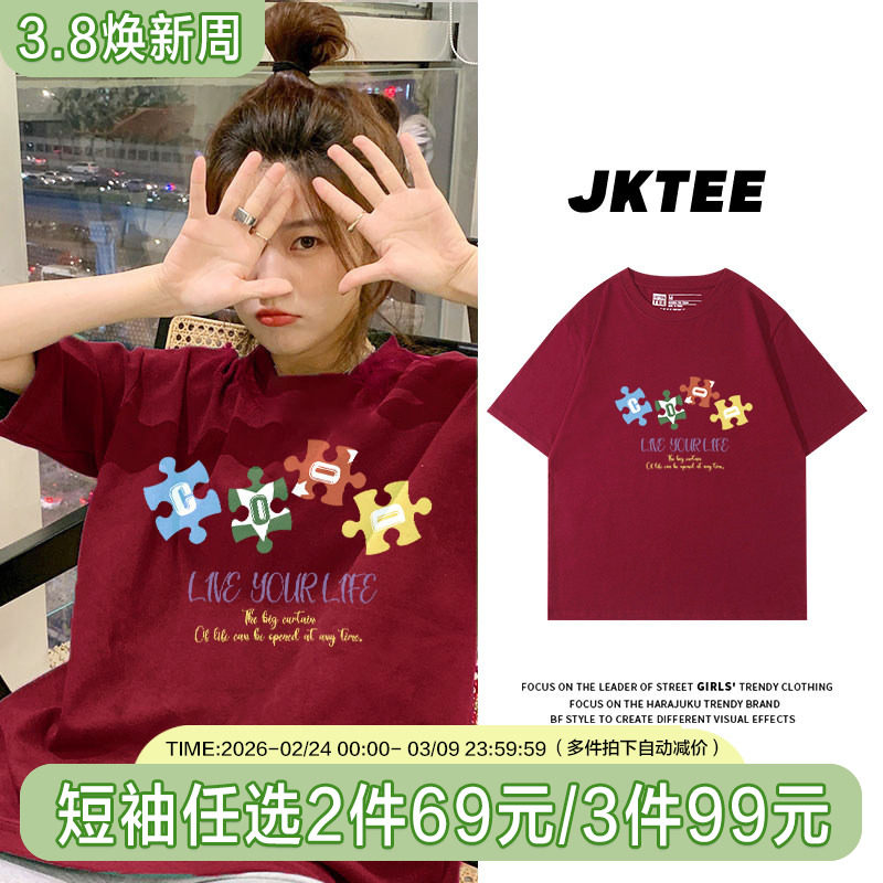美式复古简约风酒红色正肩短袖t恤女显白韩版宽松学生半袖上衣潮