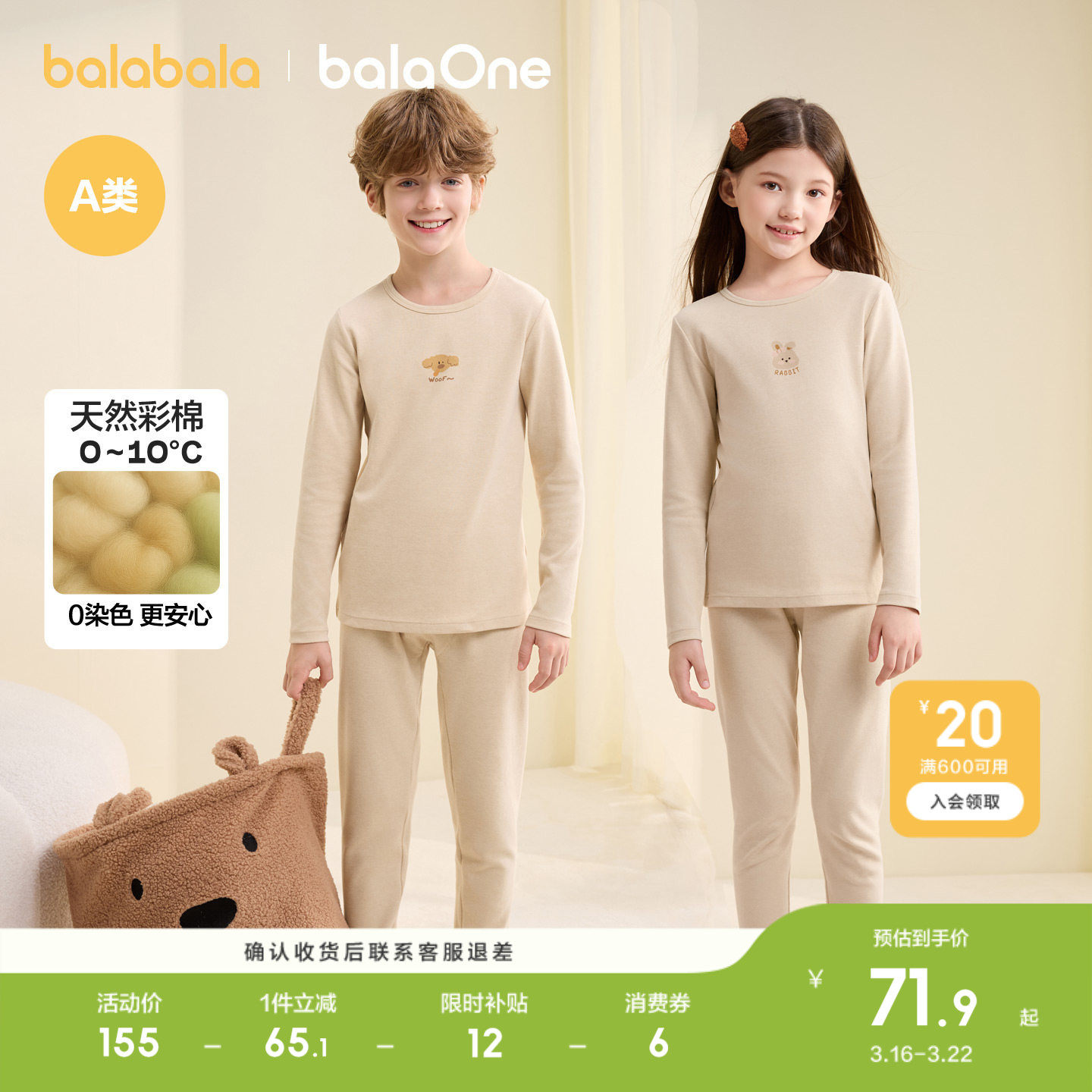 巴拉巴拉儿童内衣套装秋冬加厚男女童秋衣秋裤睡衣打底两件套彩棉