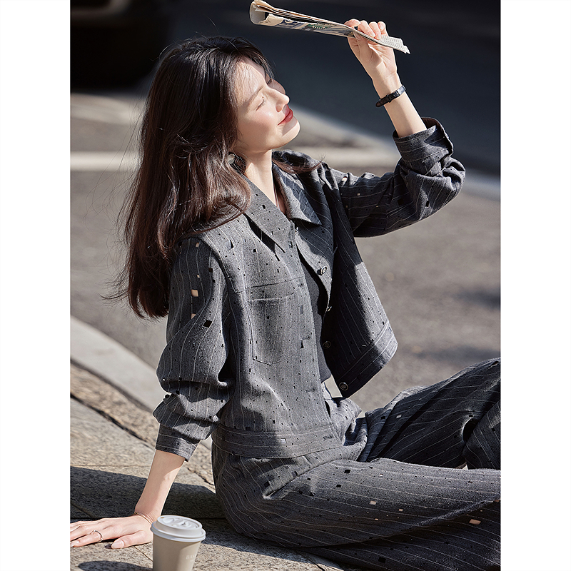 时尚气质设计感西装条纹外套长裤套装女2025年春季新品通勤两件套