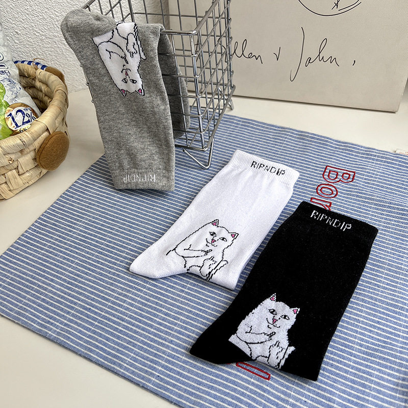 韩国ulzzang原宿字母黑白灰ins长袜中指贱猫卡通棉中高筒袜子男女