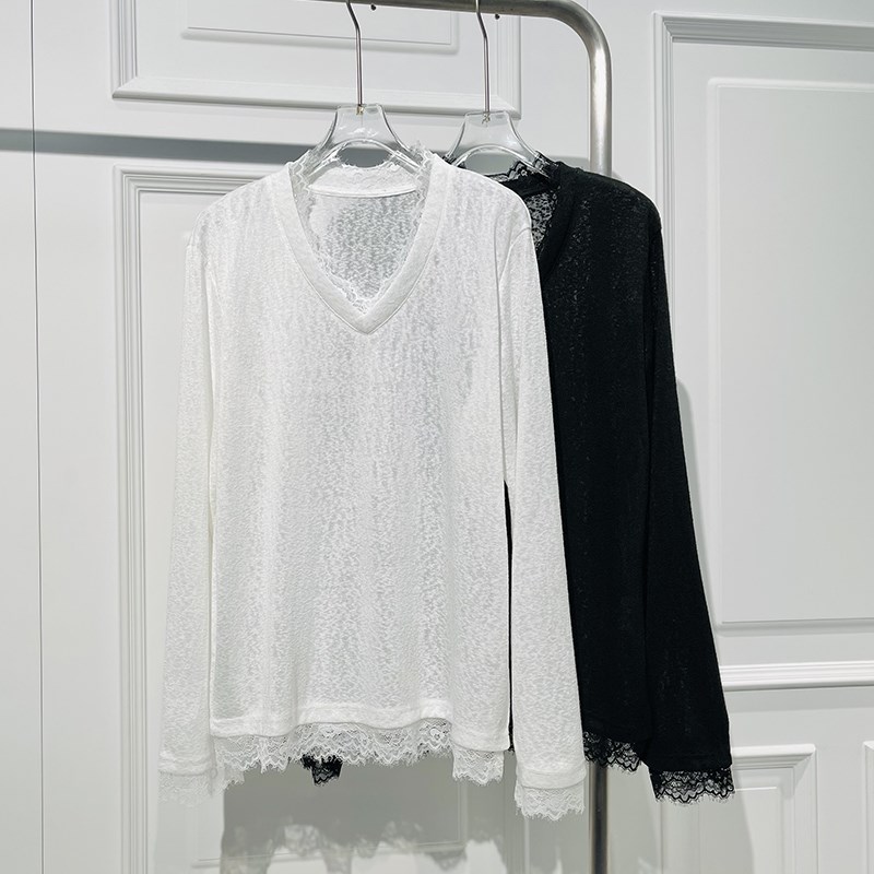 时尚百搭甜美拼蕾丝V领竹节棉T恤女2025春季新款宽松显瘦打底上衣