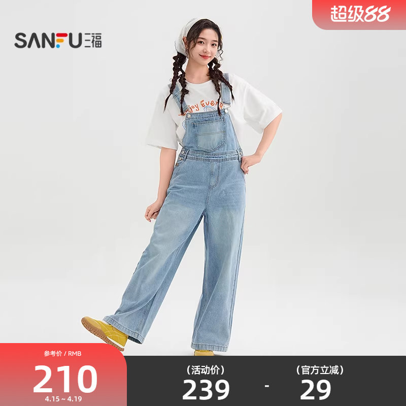 三福牛仔背带裤2026新款夏季胸前洗水口袋休闲连身裤子女装521291