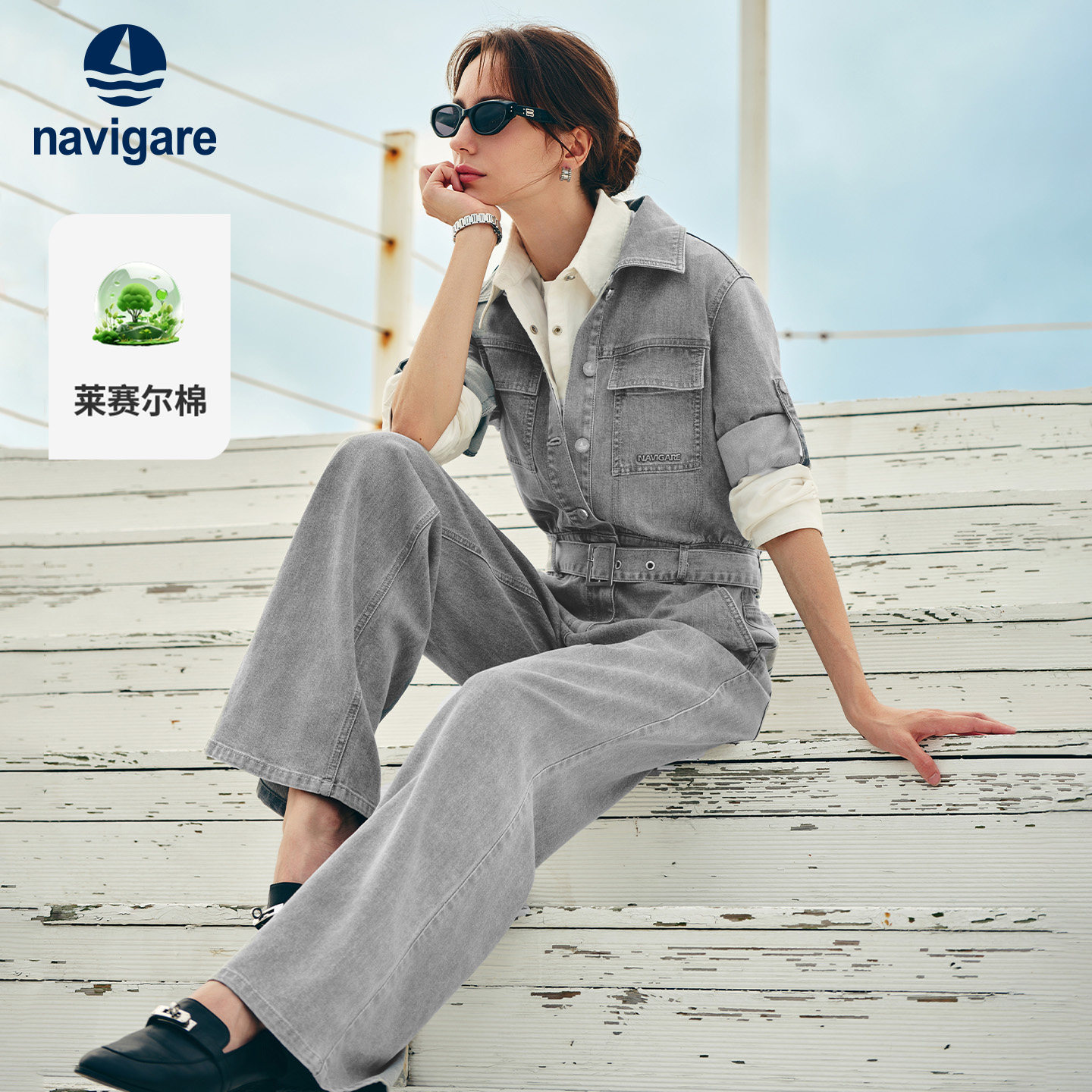 Navigare意大利小帆船蓝色长袖牛仔连体衣女2026春季新款休闲套装