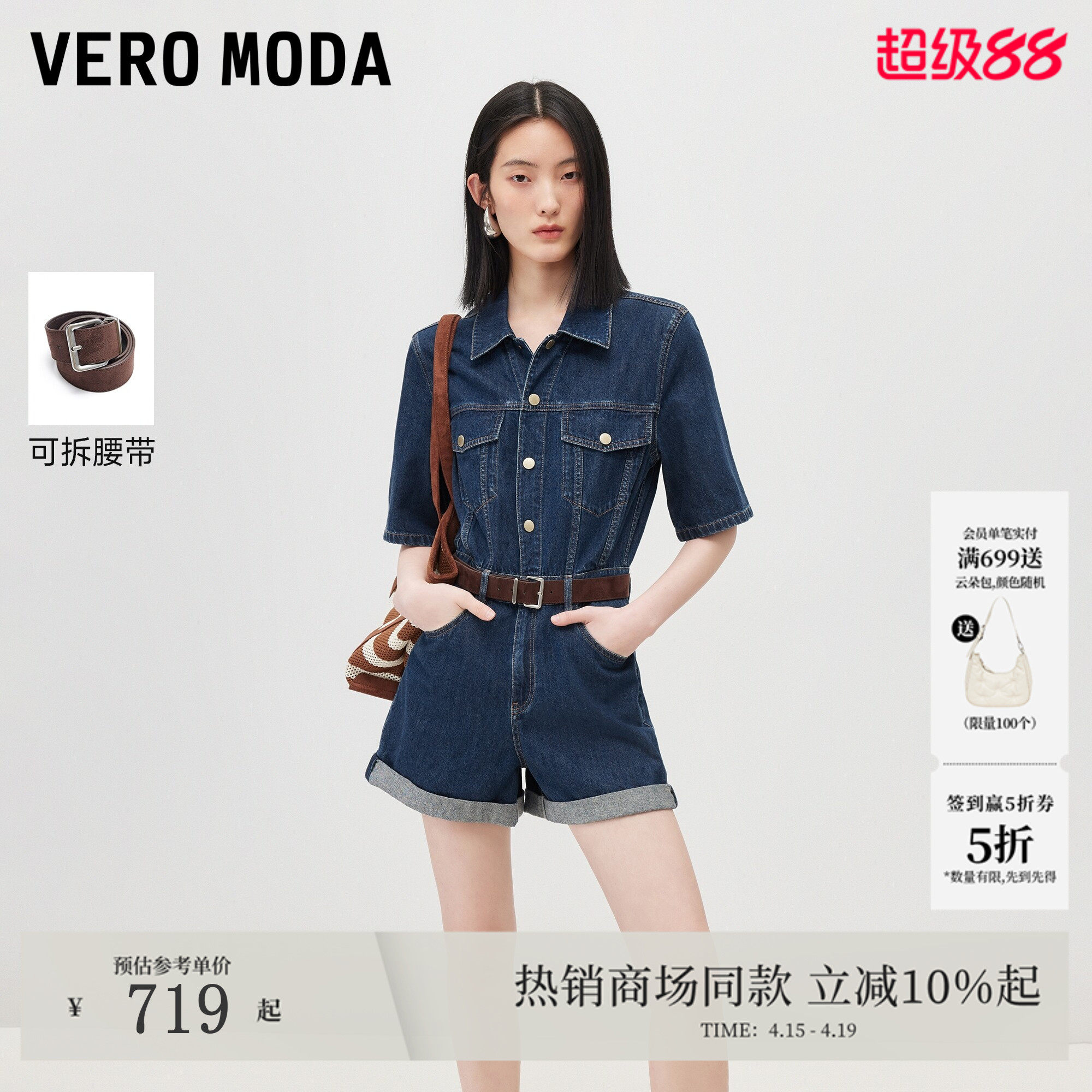 Vero Moda牛仔裤女2026夏季新款纯棉翻领短袖腰带连体裤326276001