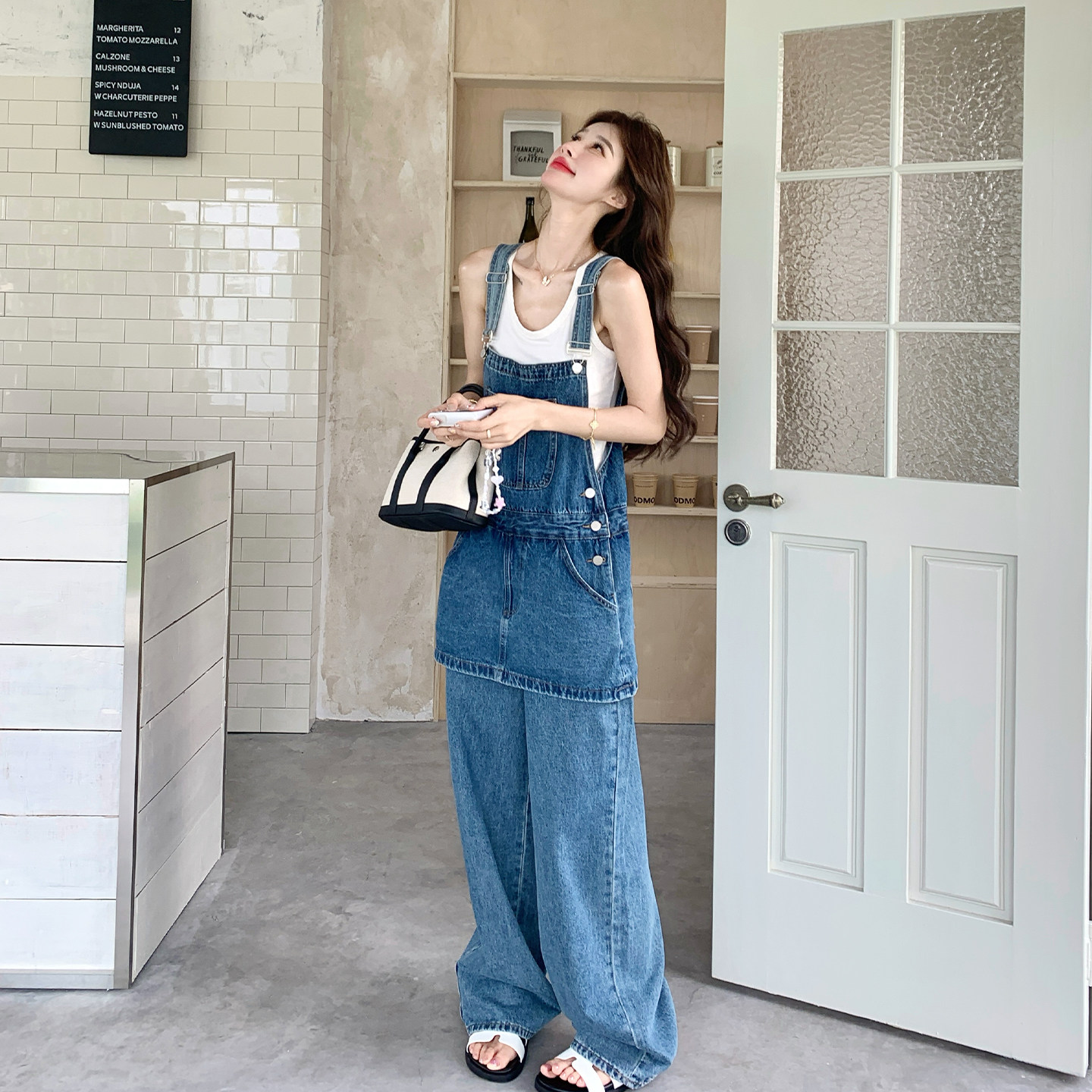 SMIIILE复古做旧宽松丹宁牛仔背带裤女纯棉重磅原牛直筒连体裤