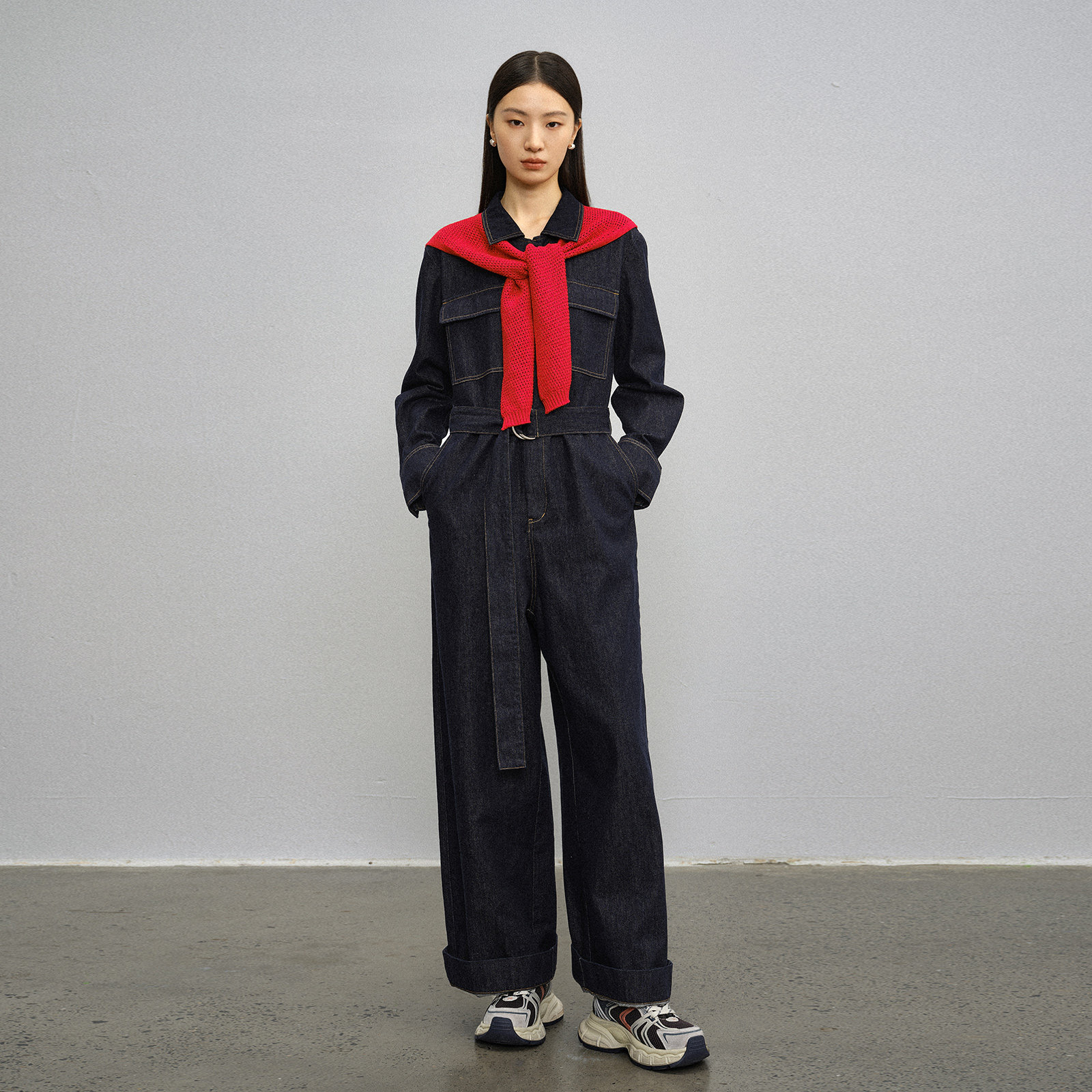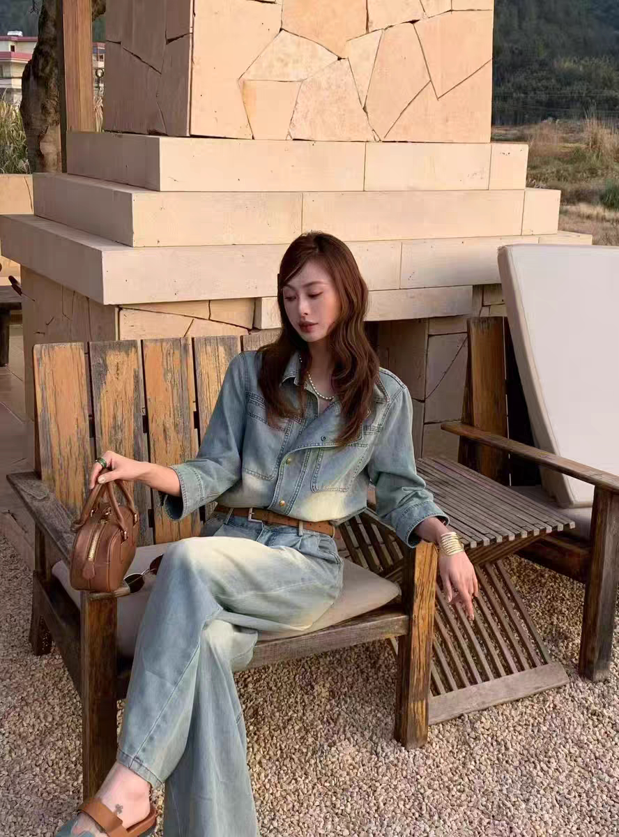 2026春季新款时尚帅气设计感宽肩长袖衬衣式牛仔连体裤显瘦长裤