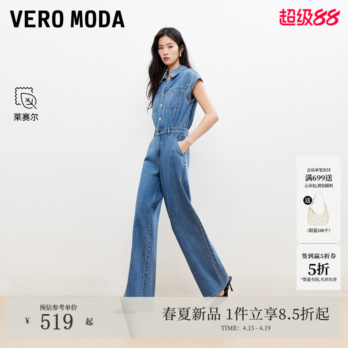 Vero Moda牛仔裤女2026春季新款含棉莱赛尔背带小盖袖口袋连体裤