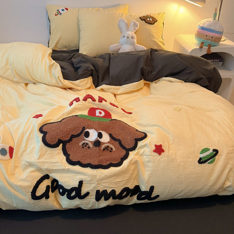 ins奶油黄可爱滑板kt毛巾绣水洗棉床单四件套纯棉被套全棉三件套